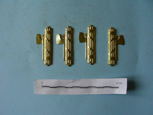 Tre fasci littori con scure laterale rivolta a sinistra, un fascio littorio con scure laterale rivolta a destra; con fori per l'applicazione su divisa.