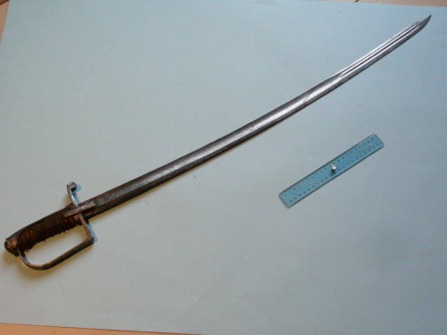 Standard militare; lama curva, a filo, punta e controfilo; ampie sgusciature sui due lati per i primi tre quarti; per l'ultimo quarto due sgusci al centro per la lunghezza del controfilo; punta ribassata alla pandura. Incisioni ad acido con motivi floreali e militari fino a metà lama. Guardia a staffa ad un solo ramo; ramo di parata a riccio con spacco per dragona. Alette fermafodero rettangolari. Cappetta lunga, con dorso sfaccettato. Bottone a calotta con codolo ribattuto. Impugnatura rivestita con cordellina a due fili intrecciati.