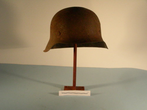 Calotta estroflessa con due fori di aerazione e tre rivetti di fissaggio per il cerchio che sosteneva l'imbottitura interna. Visiera pronunciata.