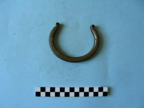 elemento decorativo a forma di “manico di secchio”; è caratterizzato da decorazioni geometriche a bulino e a punzone sui tre lati esterni. La parte interna si presenta al grezzo di fusione.