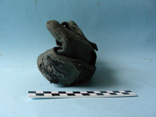 Floscia, con visiera ripiegata sulla fronte e paraorecchi fissati con un bottone sulla sommità. Colore girigio-verde militare. Foderata all'interno.
