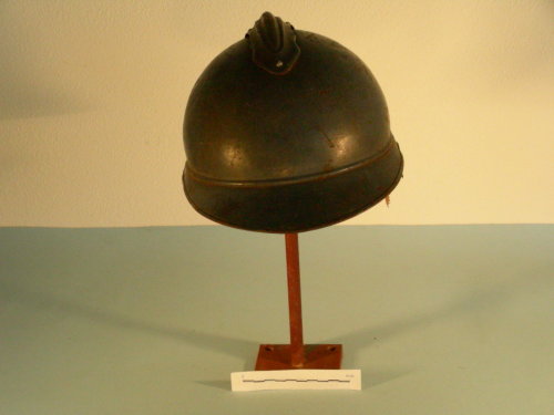 Calotta ovoidale con visiera e coprinuca fissate da ribattini; crestina molto pronunciata. Presente una piccola parte del sottogola.