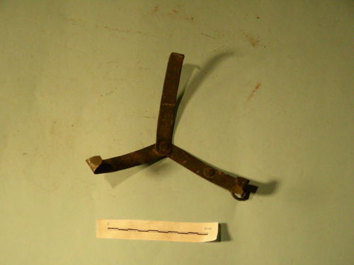 A tre bracci fissati al centro con ribattino e piegati a uncino all'estremità. Presente un gancio ad anello sul braccio superiore.