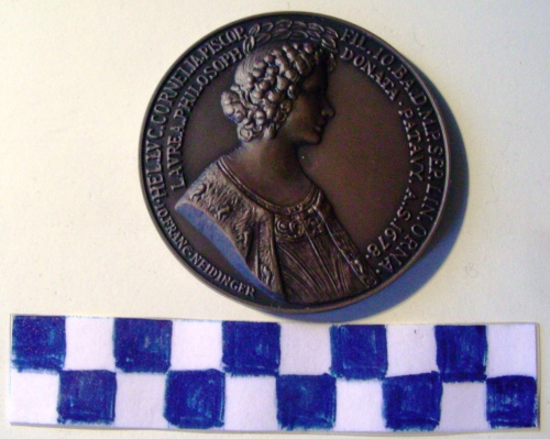 Di forma circolare. Sul recto al centro in rilievo busto femminile a destra con corona d'alloro sul capo e mantello dottorale d'ermellino sopra la veste ricamata. Doppia iscrizione lungo la corona. Sul verso, al centro, in rilievo goccie di rugiada che scendono dal cielo ad alimentare una conchiglia aperta galleggiante sulle onde del mare. Iscrizioni lungo la corona ed in esergo.