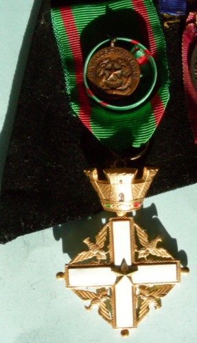 Croce greca di smalto bianca, bordata e pallinata in oro con al centro una stella in rilievo a cinque punte in oro e fra i bracci quattro aquile romane in oro ad ali spiegate. La croce è sormontata, collegata a snodo, da una corona portante tre torri in oro con sottostanti un piccolo cerchio verde, un rombo bianco ed un'ellisse rossa. Nastro con i colori dell'ordine, due piccole bande rosse inn campo verde con una coccarda dagli stessi colori sovrapposta al centro. All'interno della coccarda è cucita una piccola medaglia in bronzo. Sul dritto in rilievo stella a cinque punte con ruota dentata entro corona d'alloro stretta da nastro con iscrizione. Sul verso una corona d'alloro.