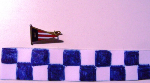 A forma di fiamma con asta a sinistra divisa in due campi. Il primo di colore nero con al centro simbolo non identificabile. Il secondo con tre strisce orizzontali rosse intervallate da due bianche. Sul verso spilla di fissaggio e punzoni..