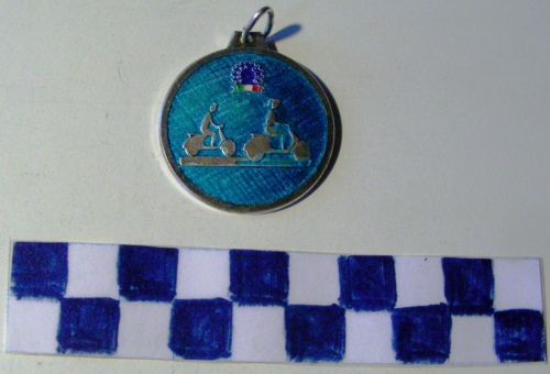 Di forma circolare, con corona argentata. Sul recto, al centro in rilievo le figure stilizzate di color argento, in campo azzurro, a destra di un ragazzo e di una ragazza su due Vespe. Nella parte superiore una corona dentata di colore blu, con profili d'argento con sottostante cartiglio con i colori nazionali. Sul verso iscrizioni. Anello all'appiccagnolo.