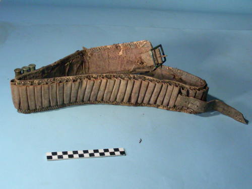 Cinturone terminante con una fibbia a sinistra ed un cinturino a destra applicato ad un quarto della lunghezza a coprire parte degli alloggiamenti dei proiettili. Sul cinturone sono cuciti 59 alloggiamenti per cartuccia decorati a motivi geometrici. Il passante ed il cinturine sono decorati con inserti di pelle di colore più chiaro.