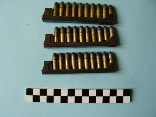 Bossolo di forma cilindrica, con fondello; proiettile conico con punta arrotondata. Le 30 cartucce conservano tre piastrine metalliche con alette laterali e fermo scorrevole e zigrinato.