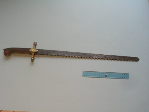lama dritta con dorso a sega, senza taglio. Punta tozza triangolare al centro. Crociera con estremità a forma di ghianda e due alette stondate. Impugnatura sagomata a becco con guancette di legno liscio. Una bandella metallica fascia la parte stretta. Insolito bottone disossato che fissa la lama all'impugnatura.
