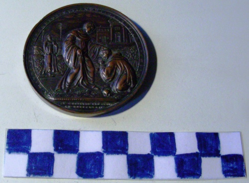 Di forma circolare. Sul recto, al centro, in rilievo busto a sinistra di San Benedetto nimbato, in preghiera, a ricevere la luce sacra. Iscrizione lungo la corona. Sul verso, al centro, in rilievo, San Mauro che impone la mano sul capo di un fedele inginocchiato. In secondo piano, a sinistra la figura di un santo nimbato, alberi di palma e la facciata di un tempio. Iscrizioni lungo la corona ed in esergo.