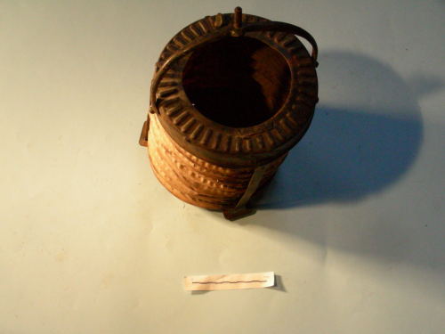 Manico fissato lateralmente con due rivetti, con piolo centrale per il fissaggio. Contenitore centrale per olio e stoppino fissato alla base con catenella; foro zigrinato a vite. Bordo superiore scanalato. Tre gambe pieghevoli terminanti a piedino, fissate alla parte superiore, che permettono l'apertura del corpo centrale, piegato a fisarmonica. Anello centrale sulla base.