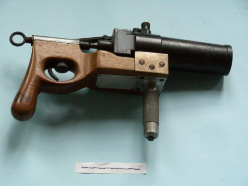 Parti metalliche incassate in un massiccio blocco di legno con impugnatura e ponticello del grilletto; alla cassa sono fissati lo scatto, con viti a legno, la canna e l'otturatore. Otturatore a blocco scorrevole lateralmente con meccanismo a leva, bloccato in chiusura da un piolo a molla fissato alla leva di manovra; l'otturatore è alloggiato in apposite scanalature ricavate nella mortasa che chiude la parte posteriore della canna, dove è presente la camera di cartuccia. Sistema di percussione indiretta alloggiato nella parte posteriore dell'arma. Sistema di ammortizzazione del rinculo installato nella parte inferiore, consistente in un mollone fissato alla parte metallica che scorre su scanalature inserite nella cassa. Impugnatura anteriore avvitata alla cassa, con all'interno apposito attrezzo per rimuovere i bossoli sparati.