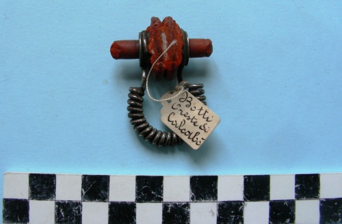 Molletta di metallo a forma di arco fissata a due anelli laterali nei quali sono inseriti due tamponi color mattone con la superficie interna zigrinata.