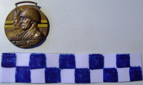 Di forma circolare. Sul recto, al centro in rilievo, busti affiancati a sinistra di due soldati, uno in divisa attuale e uno in divisa antica. Dietro le figure è presente una mostrina orizzontale di colore giallo con banda nera centrale. Iscrizione sotto la mostrina ai lati delle figure e ulteriore iscrizione sotto i busti. Sul verso, stemmi in posizione obliqua affiancati e coronati entro cartigli. Su quello di destra sono raffigurati una croce sovrastante un'aquila rivoltata e spiegata reggente tra gli artigli un animale. Quello di sinistra è diviso in quattro settori. Iscrizione sotto gli stemmi.