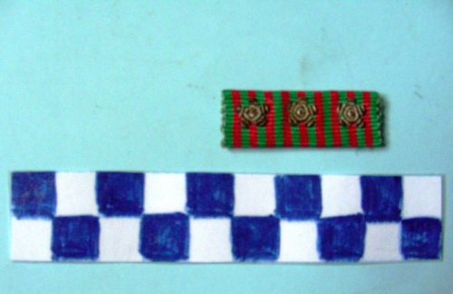 Composto da dodici bande verdi intervallate da undici rosse con applicate tre stellette in canottiglia dorata rappresentanti gli anni di guerra.