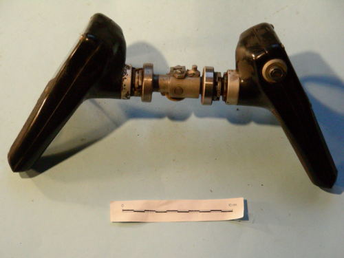 A due impugnature a guancette zigrinate, fissate con cinque viti ciascuna; un grilletto per ogni impugnatura, in posizione anteriore, con guardamano. Pulsante per collegamento microfono in posizione posteriore sull'impugnatura destra. Raccordo tra le due impugnature con flange e ruote di movimento; collegamenti elettrici e perno snodato al centro.