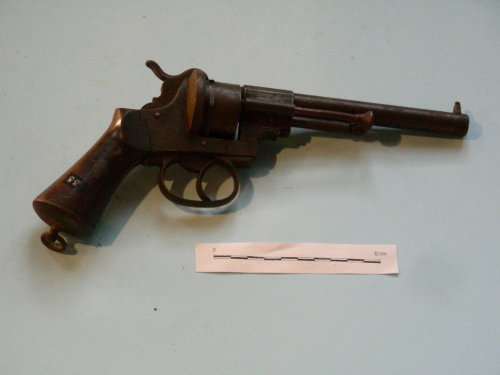 Castello aperto; tacca sulla testa del cane e mirino a piramide in volata; tamburo fisso a sei cartucce. Canna rigata. Dotata di ponticello e coccia con anello per correggiolo. Bacchetta di espulsione fissa sul lato destro del castello. Meccanismo a leva di sconnessione rapida del tamburo e della canna.