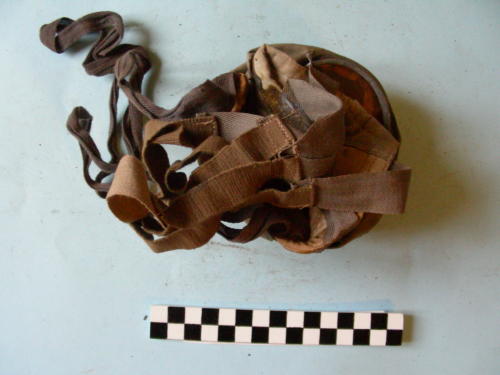 Facciale con due lenti circolari contornate da lamierina metallica, sei lacci di fissaggio alla nuca cuciti al bordo e raccordati. Alloggiamento per il filtro con foro filettato alla base.
