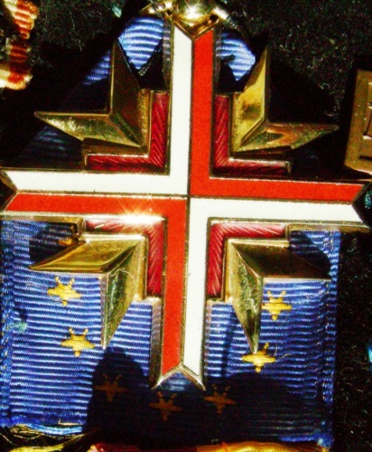 Tre croci sovrapposte, croce di Malta dorata, disassata, croce greca smaltata in rosso con profili dorati e croce ad otto punte smaltata, con profili dorati, ogni braccio diviso in due settori uno bianco e l'altro rosso. Sul verso, dorato, al centro una iscrizione in rilievo entro un cerchio. Nastro blu con dodici stelle a cinque punte disposte in cerchio..