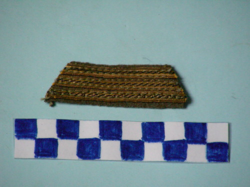 Ritaglio a forma di trapezio con tre striscie dorate decorate con barrette oblique di colore nero, sottopannate in grigio-verde.