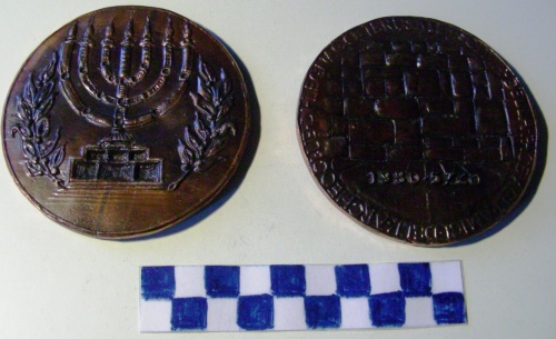 Di forma circolare. Sul recto, al centro, in rilievo, un candelabro a sette bracci (Menorah) su un tabernacolo concavo,fiancheggiato da due rami d'ulivo. Sul verso, al centro, in rilievo la raffigurazione del Muro del Pianto. Iscrizioni lungo la corona e sotto la figura.
