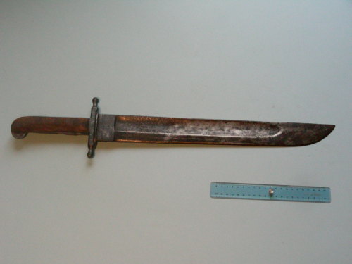 lama dritta con un solo sguscio sul lato destro. Punta al dorso molto arrotondata. Guardia a croce. Impugnatura sagomata con forte piega alla coccia