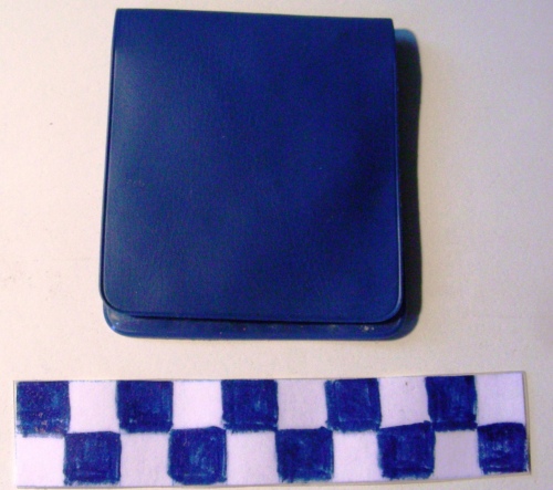 Foglio di plastica rettangolare ripiegato di colore blu. All'interno due tasche trasparenti con una iscrizione
