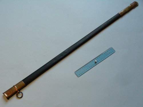Verniciato di nero satinato ad imitazione del cuoio. Con una campanella e bocchetta allargata. Puntale e cappa dorati; puntale crestato.