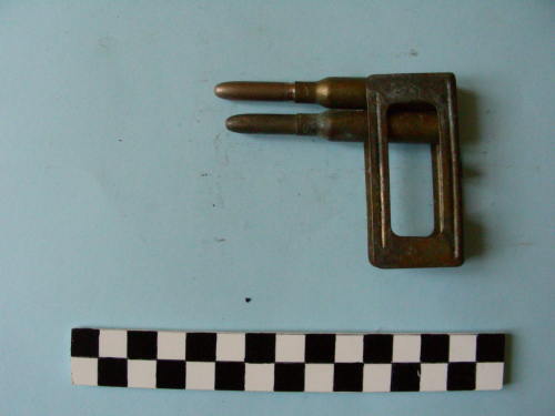Di forma cilindrica, con fondello e restringimento all'apice del bossolo e proiettile conico. Le due cartucce conservano una piastrina con bande laterali.