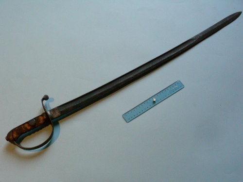 lama curva; un solo sguscio su entrambi i lati per tre quarti della lama. Punta simmetrica al centro. Guardia piena ad un solo elso. Ramo di parata a ricciolo, integrato con la guardia. Cappetta stondata, liscia, con due alette che coprono parzialmente l'impugnatura al centro e la fissano con un traversino. Bottone rotondo avvitato al codolo. Impugnatura sagomata a settori.
