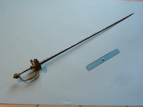 Lama dritta, a due fili, a sezione a losanga. Punta simmetrica al centro. Fornimento in unica fusione, interamente decorato a motivi vegetali, comprendente la guardia a due valve, il ramo di guardia, il ramo di parata, il bocchetto con due archetti e la base. Pomo sferico decorato a motivi vegetali con base a capitello e bottone ribattuto al codolo.