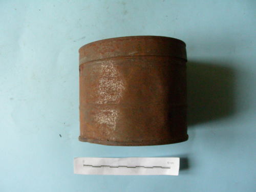 Di forma cilindrica, con coperchio a pressione e saldatura verticale. Due nervature lungo la circonferenza; contiene due dischi di cartone.