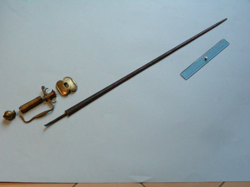 Lama dritta, a due fili, sezione a losanga. Punta simmetrica al centro. Fornimento in unica fusione comprendente la guardia a a due valve, il ramo di guardia, il ramo di parata, il bocchetto con due archetti e la base; pomo sferico non decorato con base a capitello, bottone per il codolo e foro di fissaggio per la guardia. Impugnatura con manica in filo d'ottone.