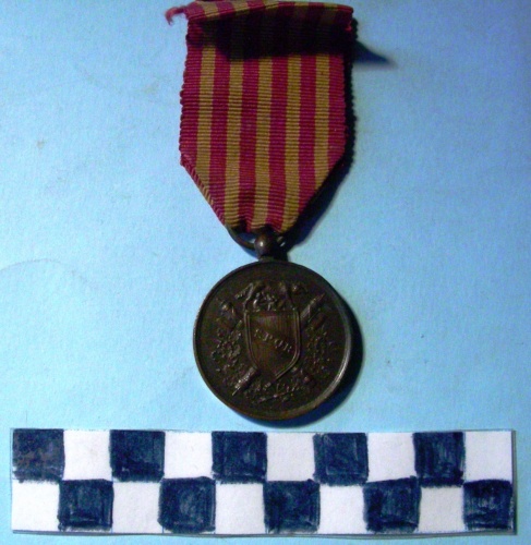 Di forma circolare. Sul recto al centro, in rilievo, scudo del Municipio di Roma sormontato da lupa capitolina a destra nell'atto di allattare Romolo e Remo, su due fasci decussati su rami di quercia legati da nastro. Iscrizioni sullo scudo e sotto la figura. Sul verso, al centro, in rilievo, entro rami di quercia legati da nastro e sotto stella a cinque punte iscrizione. Ulteriore iscrizione in basso. Anello all'appiccagnolo e nastro con cinque strisce gialle in campo rosso.