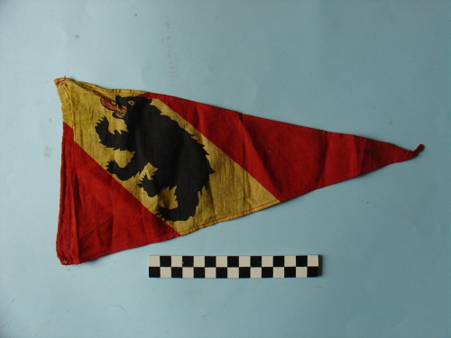 in tela stampata, a forma triangolare; campo rosso con al centro banda trasversale gialla su cui è stampato un orso rampante di colore nero.