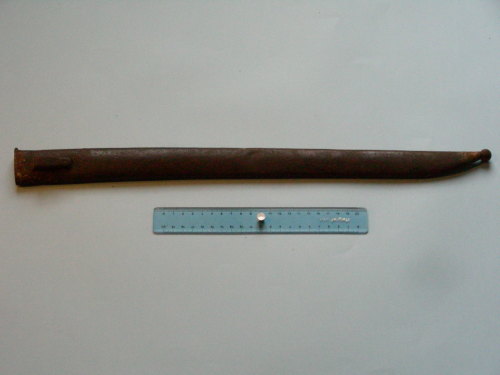 Liscio, con bocchetta allargata trattenuta da ribattini, bottone fermatasca e puntale arrotondato.
