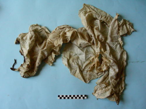 Resti di tessuto di forma irregolare, con tracce di bruciatura; presente una cordellina.