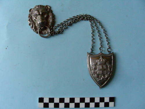placca che andava applicata alla bandoliera, formata da due elementi posti in verticale: quello superiore è a testa di leone che tiene in bocca un anello; è collegato con quello inferiore tramite una serie di tre catenelle fisse. L'elemento inferiore è formato da uno scudo sopra il quale sta il classico simbolo sabaudo; sul retro tre "ganci" sembrano essere stati aggiunti in un secondo momento.