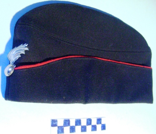 In panno di lana blu con profilo rosso che scende verso la base sulla fronte. Al centro, cucita, granata con fiamma piegata al vento. Fodera all'interno.