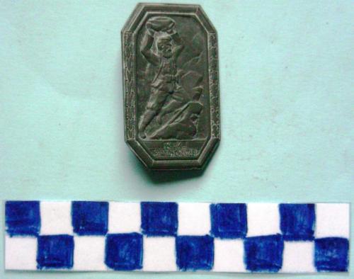 Di forma ottagonale con rami di alloro e di quercia sui lati lunghi. Al centro, in rilievo soldato rivolto a destra, con ginocchio sinistro appoggiato a dei massi, nell'atto di scagliare una pietra verso il basso. Istrizione sul lato inferiore. Sul verso due spilli di fissaggio ed iscrizione.