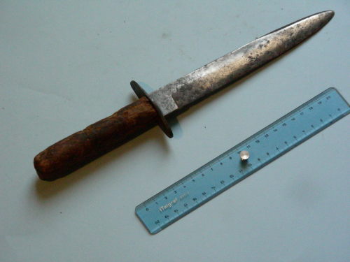 Lama dritta, ad un filo e controfilo alla punta, simmetrica al centro. Guardia a croce, dritta. Impugnatura a due guancette, fissate con spinotti.