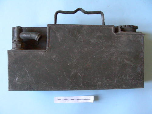 A parallelepipedo, con due maniglie basculanti laterali ed una sulla sommità. Tappo circolare scanalato, svitabile, per l'inserimento del liquido e tubo di raccordo per manicotto, svitabile. Verniciatura di colore grigio-verde.