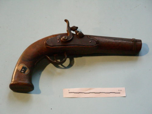 A una canna; ad avancarica, con acciarino molla avanti. Accorciata artigianalmente con taglio di canna e cassa; rigata. Canna fissata alla cassa in volata con filo di ferro e vite a legno al codolo, in culatta.