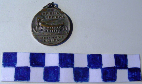 Di forma circolare. Sul recto, al centro, in rilievo la veduta dell'Arena di Verona. Iscrizione nella parte superiore ed in esergo. Anello all'appiccagnolo.