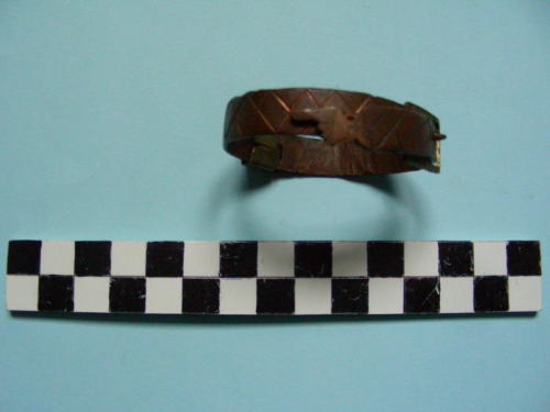 Di forma circolare, in due pezzi incernierati e snodati, aggancio a forma di cintura con fibbia, terminante con forma di mano sinistra umana chiusa con indice proteso e passante. Decorazioni a forma di losanga su tutta la circonferenza.