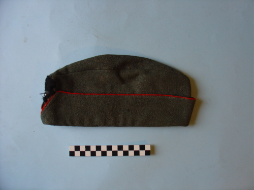 Floscia, con risvolto ripiegato all'esterno, bordato di colore rosso, e degradante a "V" sulla fronte, in corrispondenza del fregio. Colore verde militare; fregio frontale.