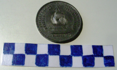 Di forma circolare. Sul recto, monumento con alla sommità un guerriero che stringe un'ascia nella destra ed uno scudo alzato e lancia nella sinistra. Iscrizioni lungo la corona e sotto la figura. Sul verso, al centro, bassorilievo con a sinistra dei pioppi, nella parte superiore sul carroccio, un gruppo di armati con lance e scudi con al centro la martinella. Nella parte inferiore, due cavalieri su cavalli rampanti con spada e mazza con ai loro piedi due soldati caduti. Iscrizioni lungo la corona e sotto la figura.