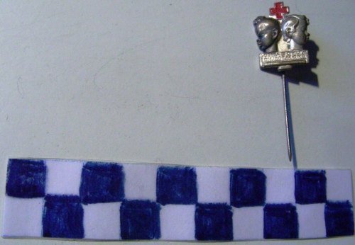 A forma di busti di bambini accollati, quello a sinistra di colore nero, a destra di colore bianco, divisa da croce greca rossa su rettangolo con iscrizione. Sopra, fascio littorio in posizione orizzontale. Sul verso, iscrizione e spilla di fissaggio.