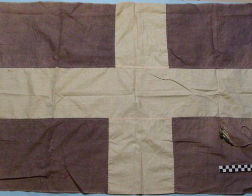 di forma rettangolare, ottenuta cucendo insieme diversi rettangoli di stoffa a formare una croce bianca con i 2 bracci di lunghezza diversa con ai lati quattro settori rettangolari di stoffa ora di colore violaceo. Su un lato minore, ai due angoli, sono cuciti due anelli nei quali è stato annodato un cordoncino intrecciato, con due fiocchi terminali, di colore bianco e azzurro.